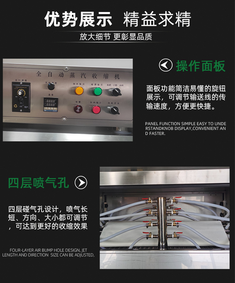 安全性高:配備溫度計及壓力表,使蒸汽壓力及收縮溫度一目了然,方便操作人員實時監控和調整;蒸汽進氣閥門裝有刻度盤,節省每班操作開機時間的同時,也提高了操作的準確性和安全性;此外,部分設備還裝有漏電保護開關、缺水報警保護等裝置,進一步增強了設備的安全性.
