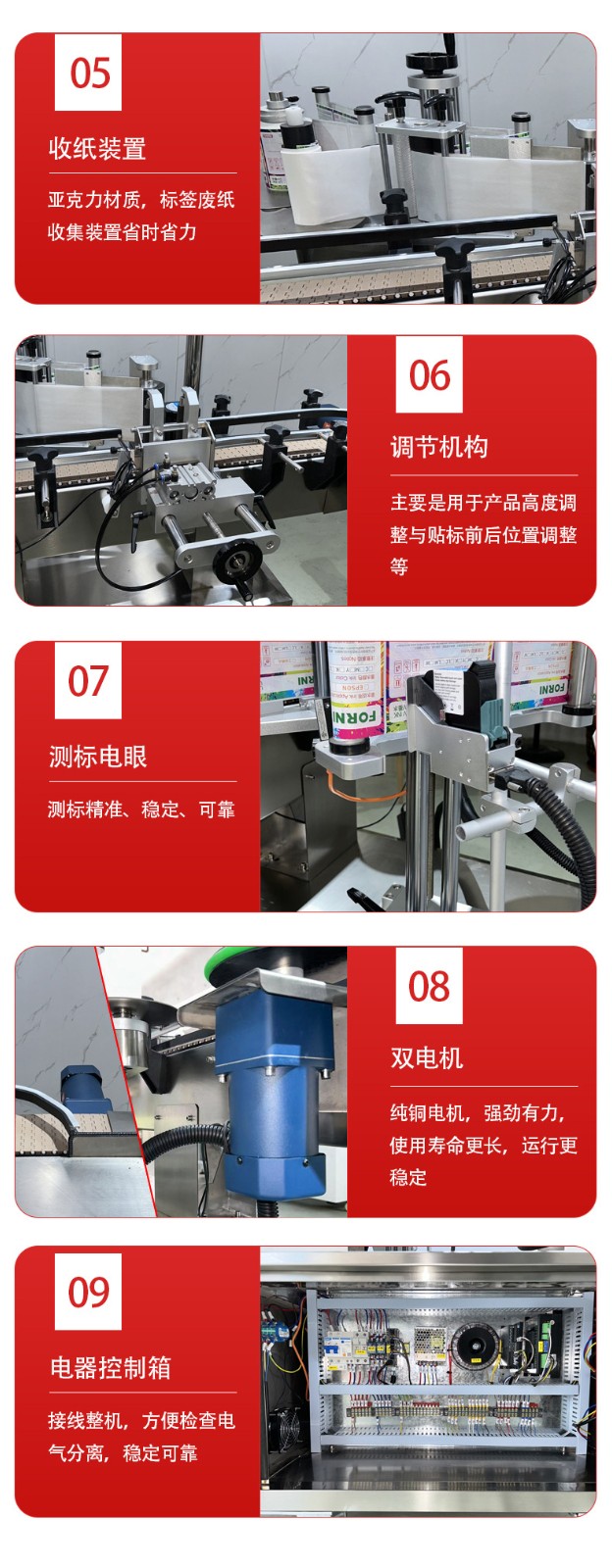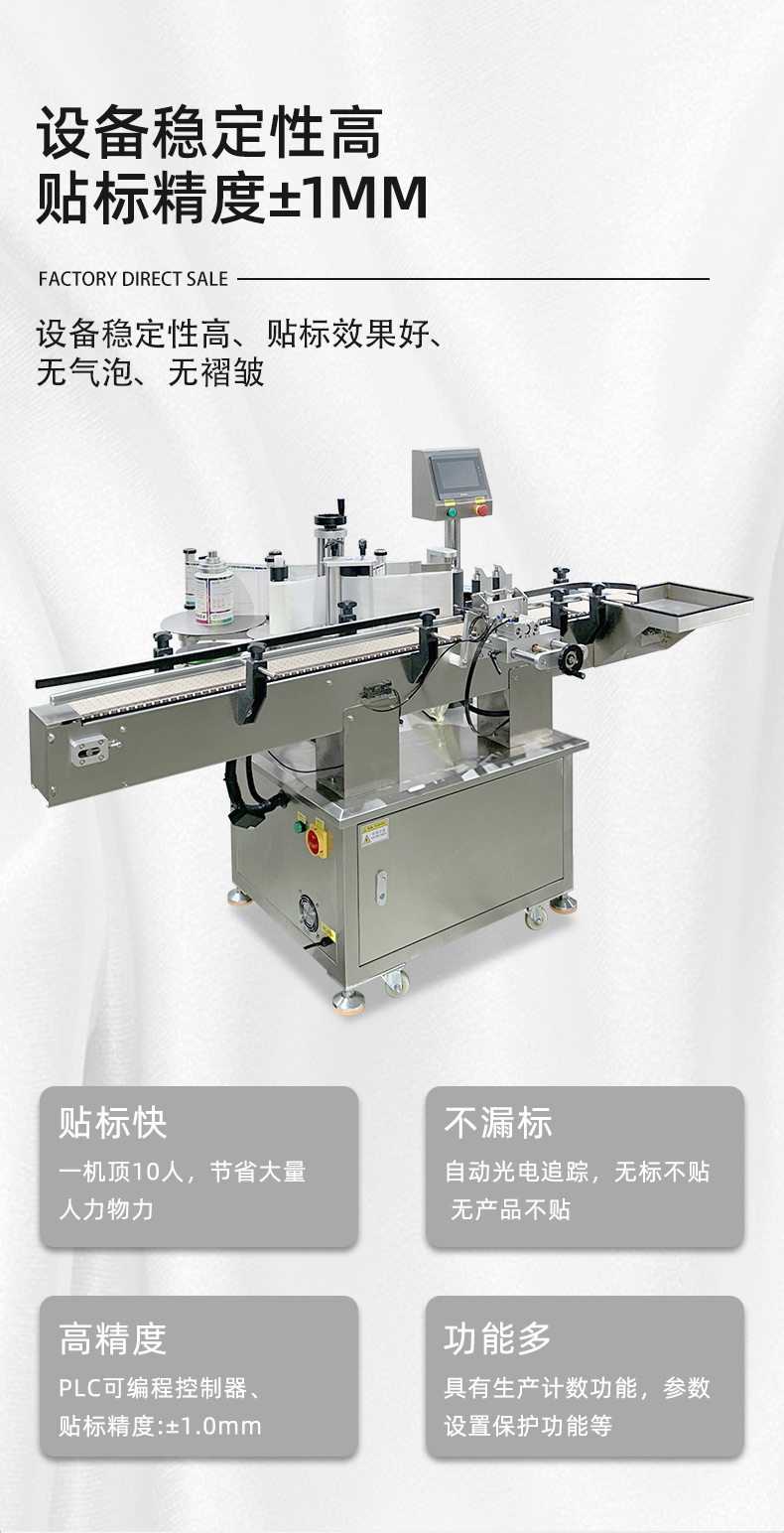 自帶 “自動分瓶、無瓶不貼標、缺標報警” 功能,無需人工分揀瓶子或監控標簽供給;部分機型還支持與前后生產線(如灌裝機、裝箱機)聯動,形成全自動化包裝流程,降低人工搬運和操作失誤的風險。