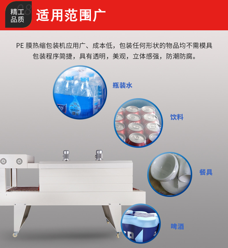 - PE 薄膜本身具有良好的柔韌性,再加上 PE 熱收縮機可以通過調(diào)節(jié)輸送速度、加熱溫度等參數(shù),使得它能夠?qū)Ω鞣N形狀(如圓形、方形、不規(guī)則形狀)和尺寸的產(chǎn)品進行包裝。例如,無論是包裝小型的文具,還是大型的工業(yè)零部件,PE 熱收縮機都能發(fā)揮作用。