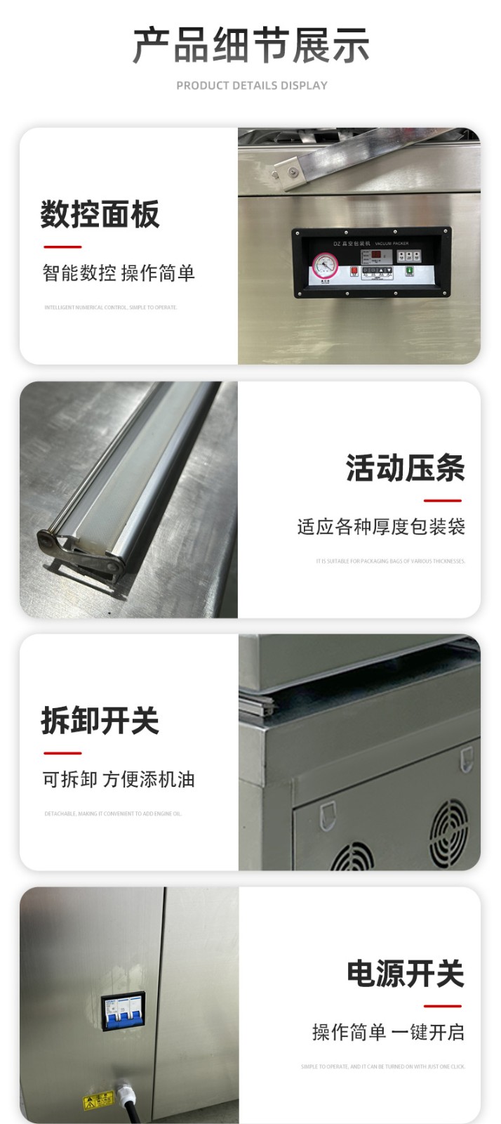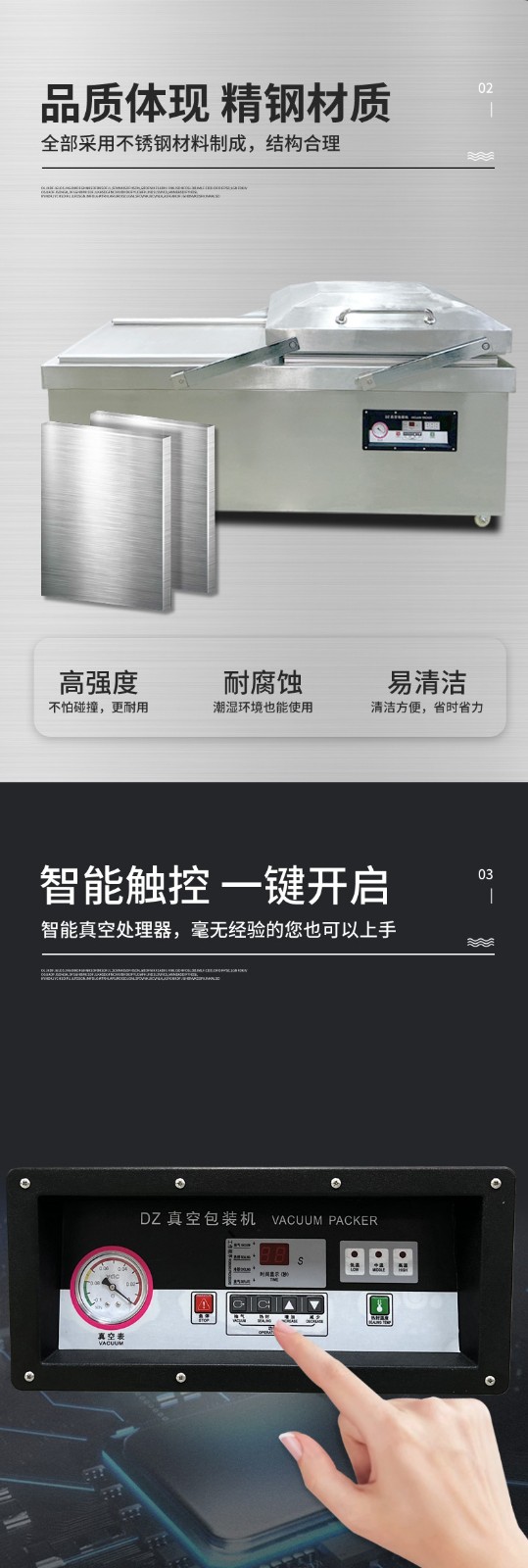 • 真空室:通常由不銹鋼制成,具有兩個對稱的工作室,可同時進行真空包裝操作,提高工作效率。工作室底部為平板狀,便于放置包裝物品,且易于清潔。