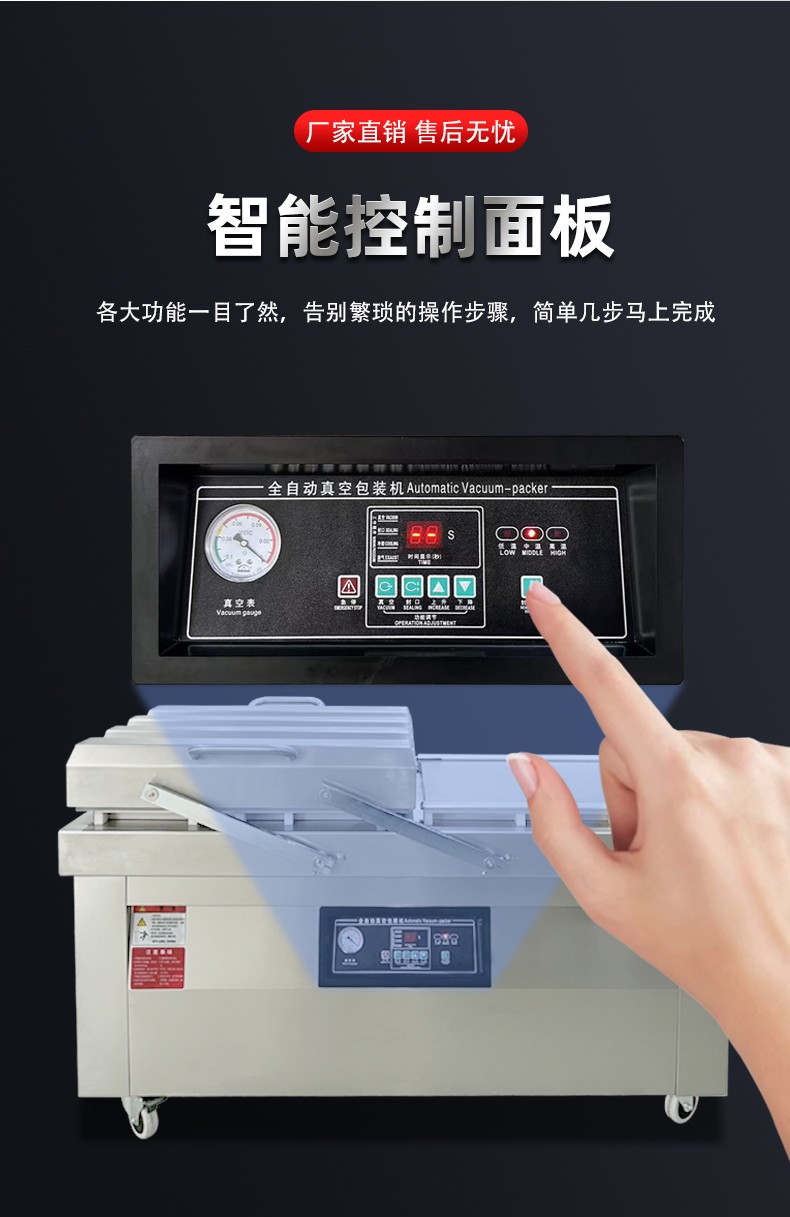 • 同一時間,右室真空蓋保持開啟,操作人員可同步將下一批待包裝產品放入右室包裝袋并擺好(即 “裝袋準備”),無需等待左室流程結束 —— 此時左室 “忙” 于抽真空密封,右室 “閑” 于裝袋,兩者并行不沖突。