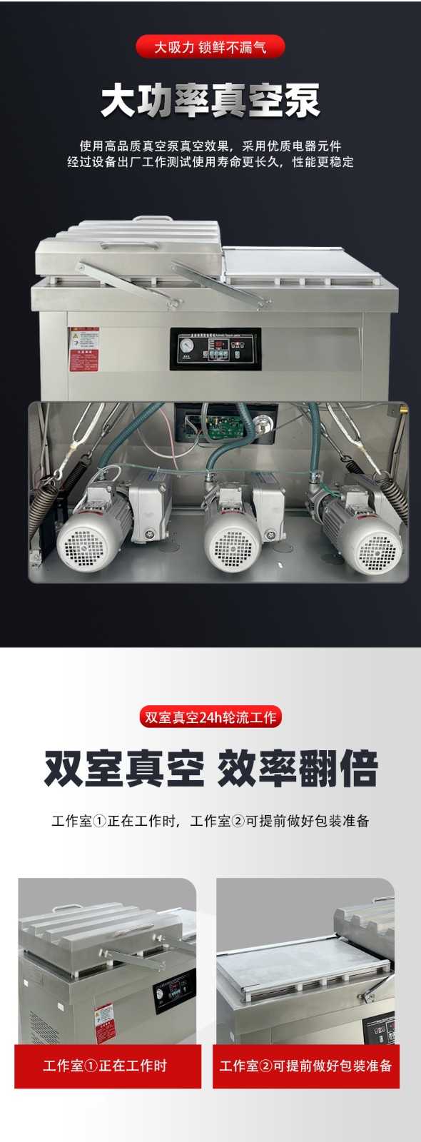 雙室真空包裝機通過 “雙真空室輪換作業” 實現抽真空與裝袋無縫銜接,核心是利用兩個獨立真空室的 “時間差并行操作”,讓設備在同一周期內同時完成 “抽真空密封” 和 “人工 / 自動裝袋”,徹底消除單室機型 “抽真空時無法裝袋” 的等待間隙,大幅提升作業效率。其具體運作邏輯和優勢可拆解為以下 3 點: