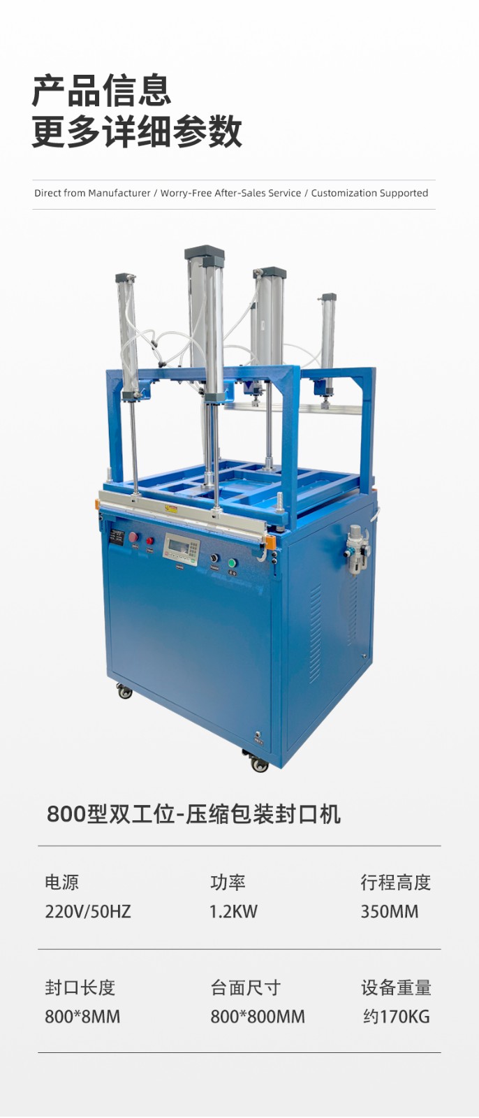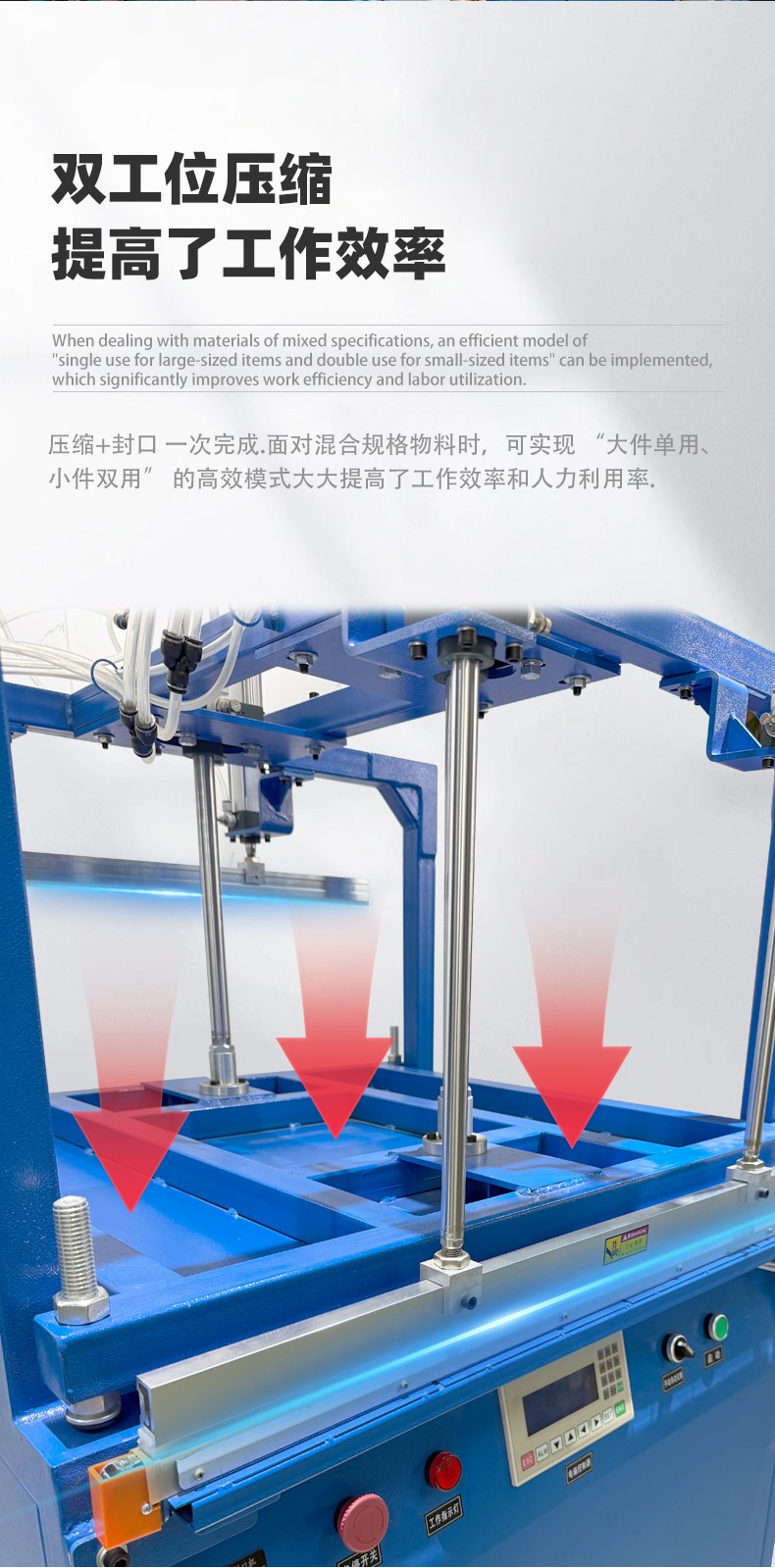 雙工位壓縮封口機:兩個工位可同時作業,一邊封口時另一個可放件 / 取件,適合中小批量、多規格產品(如多口味食品、電子元件袋),效率比單工位高 50%-80%。