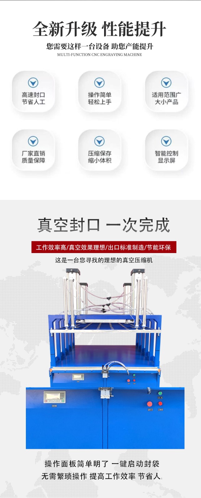 • 啟動壓縮裝置:對于具備壓縮功能的真空壓縮封口機,在達到真空度后,壓縮裝置開始工作。如果是采用壓縮板進行壓縮,壓縮板會在機械裝置(如氣缸驅動)的作用下,向產品方向移動,對產品進行擠壓。對于一些需要精細壓縮的產品,如高檔家紡產品,壓縮板的移動速度和壓力可以進行精細調節。